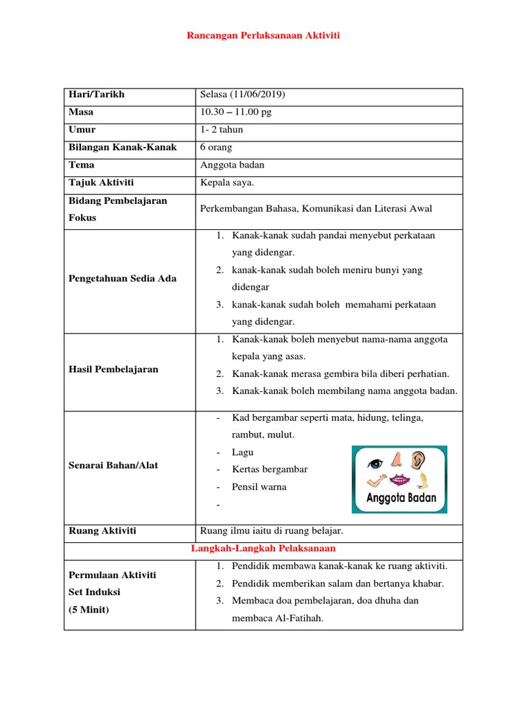 Contoh rancangan perlaksanaan aktiviti rpa di taska bidang. 4 Tahun Tarikh. Guru berinteraksi rutin harian bersama kanak kanak sebelum memulakan aktiviti.